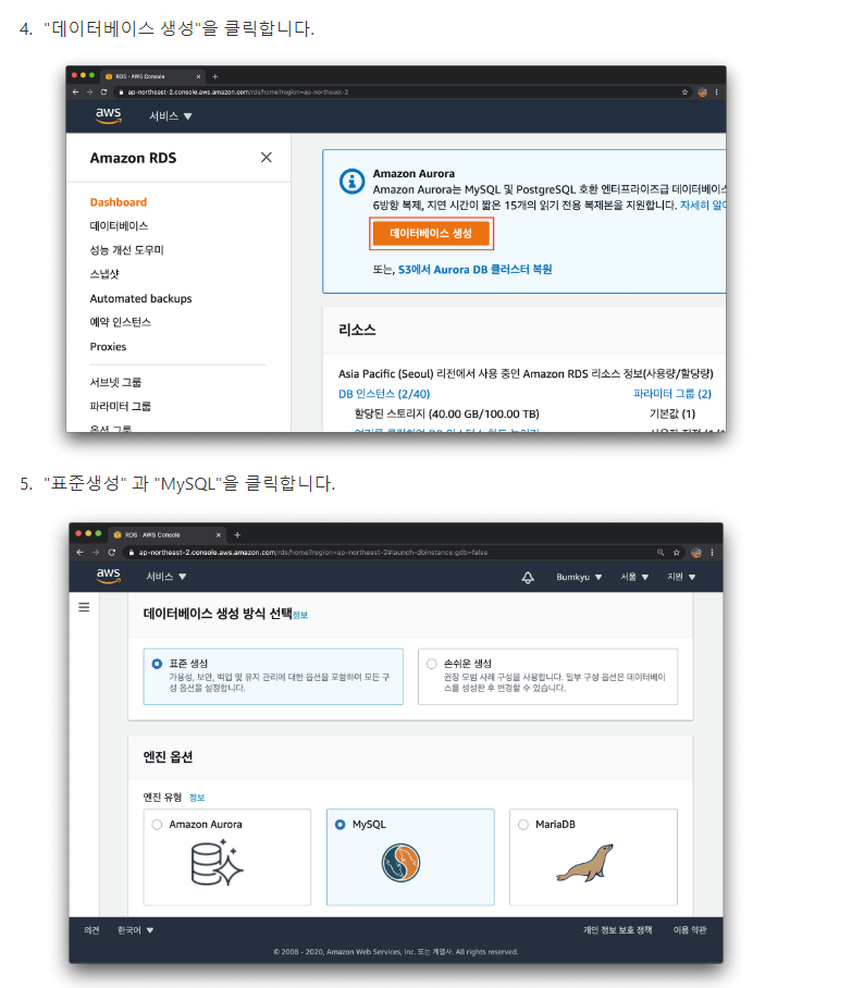 AWS 로그인 / 회원가입안했다면 회원가입 https://ap-northeast-2.console.aws.amazon.com/console/home?region=ap-northeast-2# AWS 로그인후 위 상단 검색바에 RDS를 검색하고 결과를 클릭합니다. 탬플릿에 " 프리티어" 를 선택 // *프리티어로 설정안하면 추가요금 발생할수있음* DB 인스턴스 구성과 스토리지는 설정 그대로 두고 넘어갑니다.. *퍼블릭 액세스 기능: "예" 선택* 이 설정이 되어있어야 우리 컴퓨터에서 AWS RDS 의 MySQL과 연결이 가능합니다. 꼭 퍼블릭 액세스 설정을 확인해주세요! VPC 보안 그룹: "새로 생성" 선택 새 VPC 보안 그룹 이름: [원하는 이름!!] 가용 영역: 옵션 중 아무거나 선택하셔도 괜찮아요...